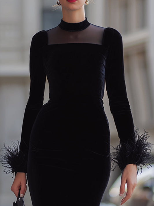 Black Velvet Feather-Trim Midi Dress With Sheer Neck