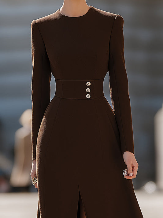 Button-Waist Long Sleeve Midi Dress In Espresso Brown