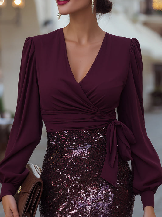 Sequin Contrast Wrap Dress With Puff Sleeves