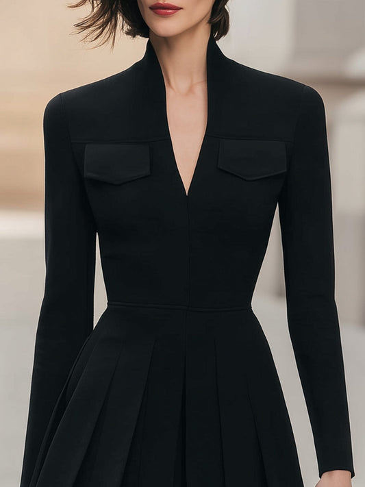 Chic Black Long Sleeve Pleated Mini Dress With Structured Collar
