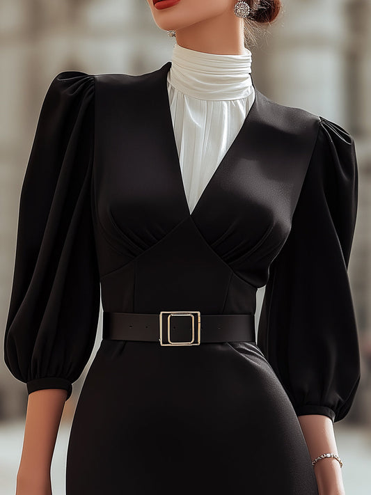 Faux Two-Piece Turtleneck Puff Sleeve Belted Pencil Dress