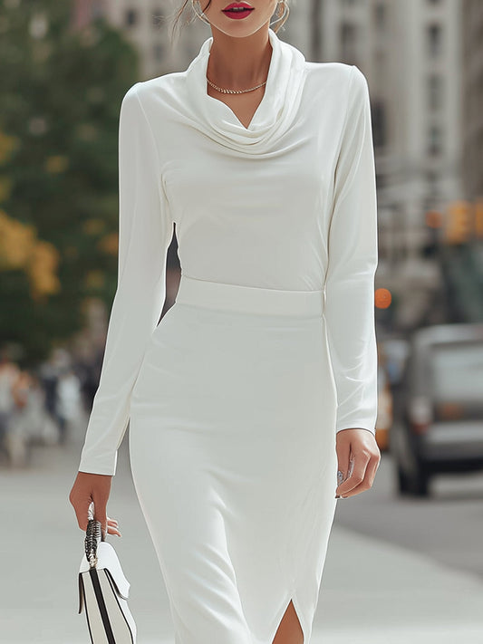 Elegant White Cowl Neck Long Sleeve Midi Dress