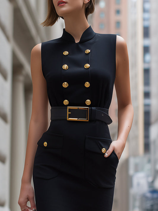 Sleeveless Black Belted Pencil Dress With Gold Buttons