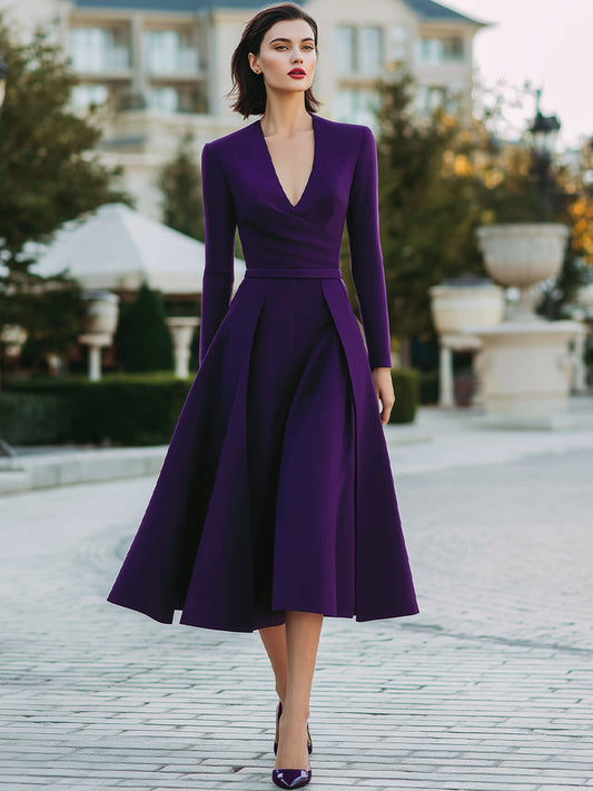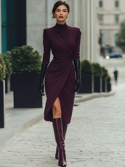Midnight Navy Draped Wrap Dress With Structured Shoulders