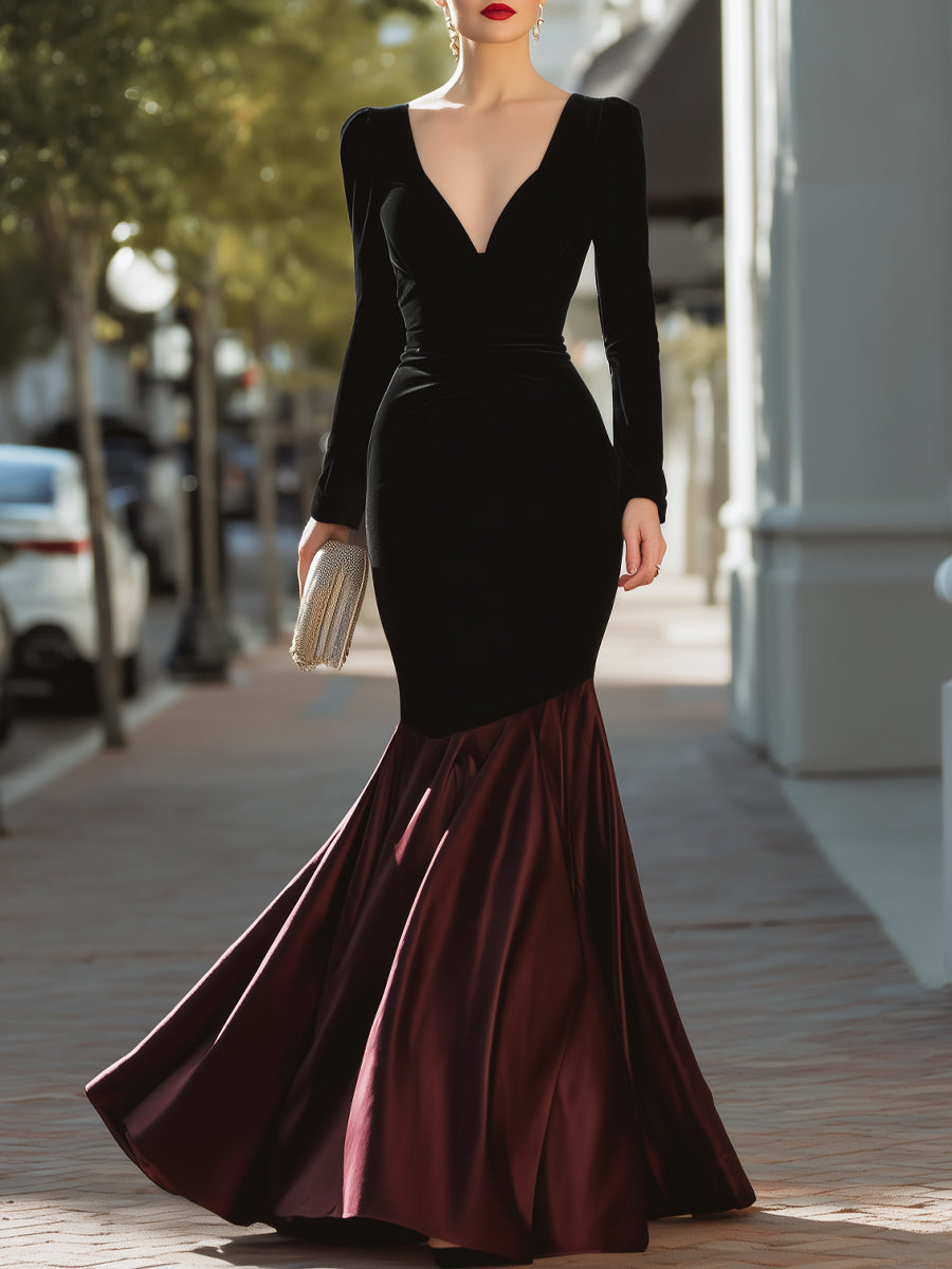 • Design: Deep V-neckline, long fitted sleeves, high-waist seam, flared mermaid hem