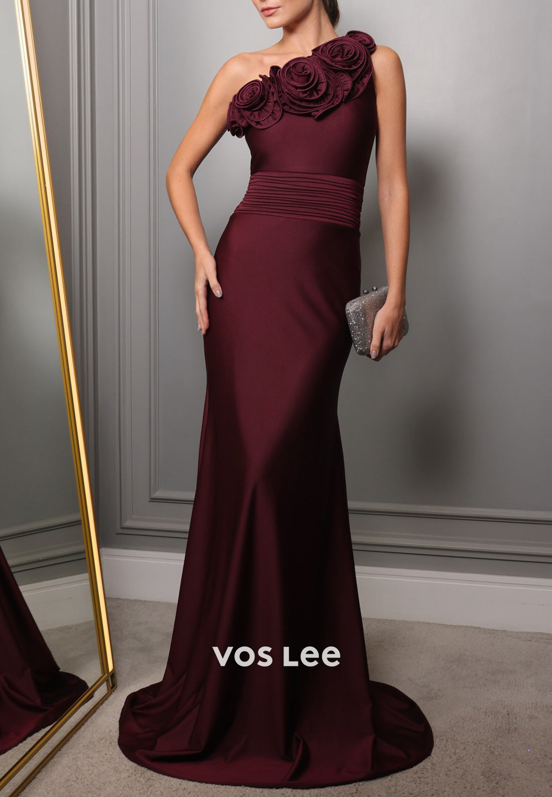 One Shoulder Floral Embellished Long Mermaid Evening Dresses with Sweep Train