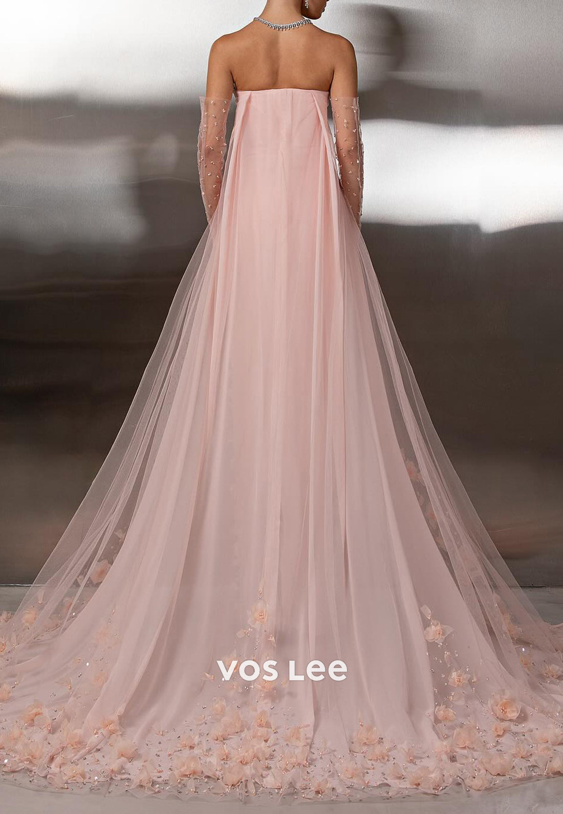 Tube Top Floral Embellished Pleated Mermaid Prom Dresses with Court Train