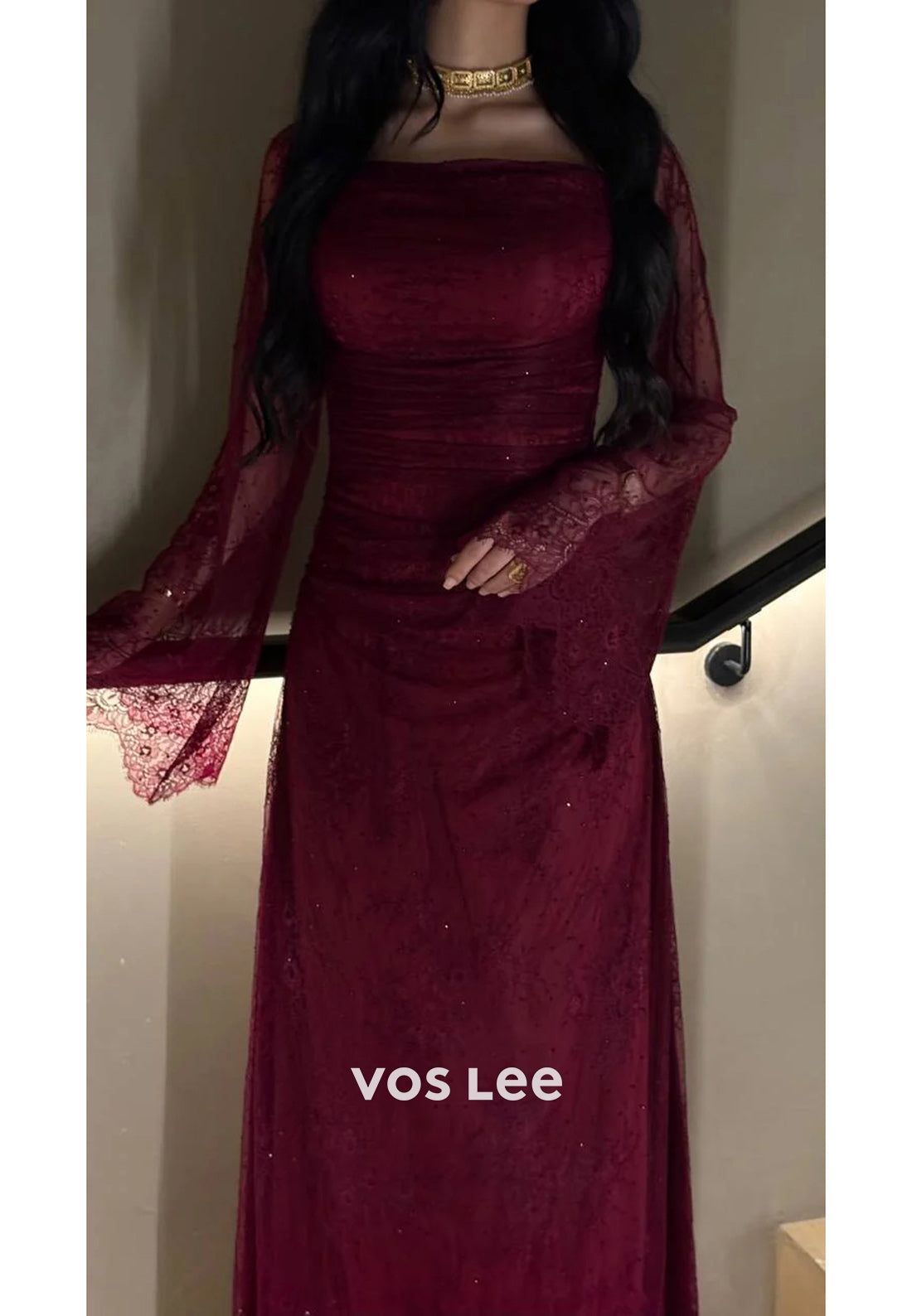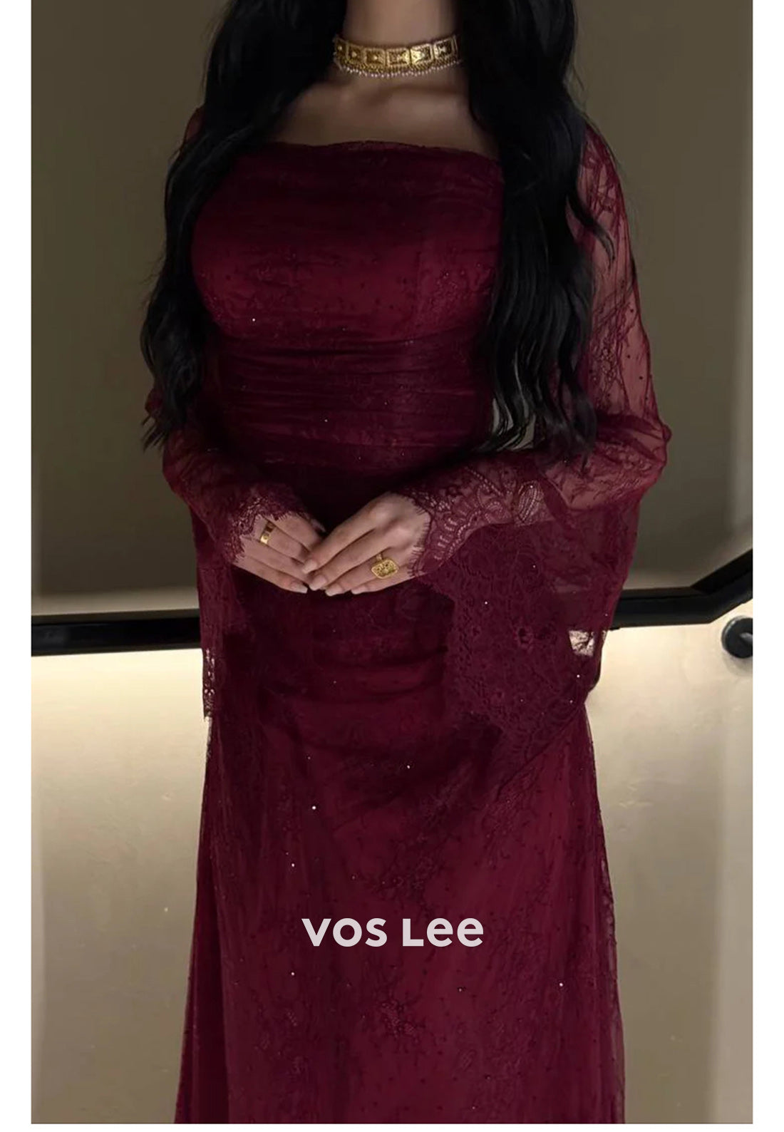 Sparkle & Shine Burgundy Allover Lace Ankle-Length Pleated Sheath Evening Dresses