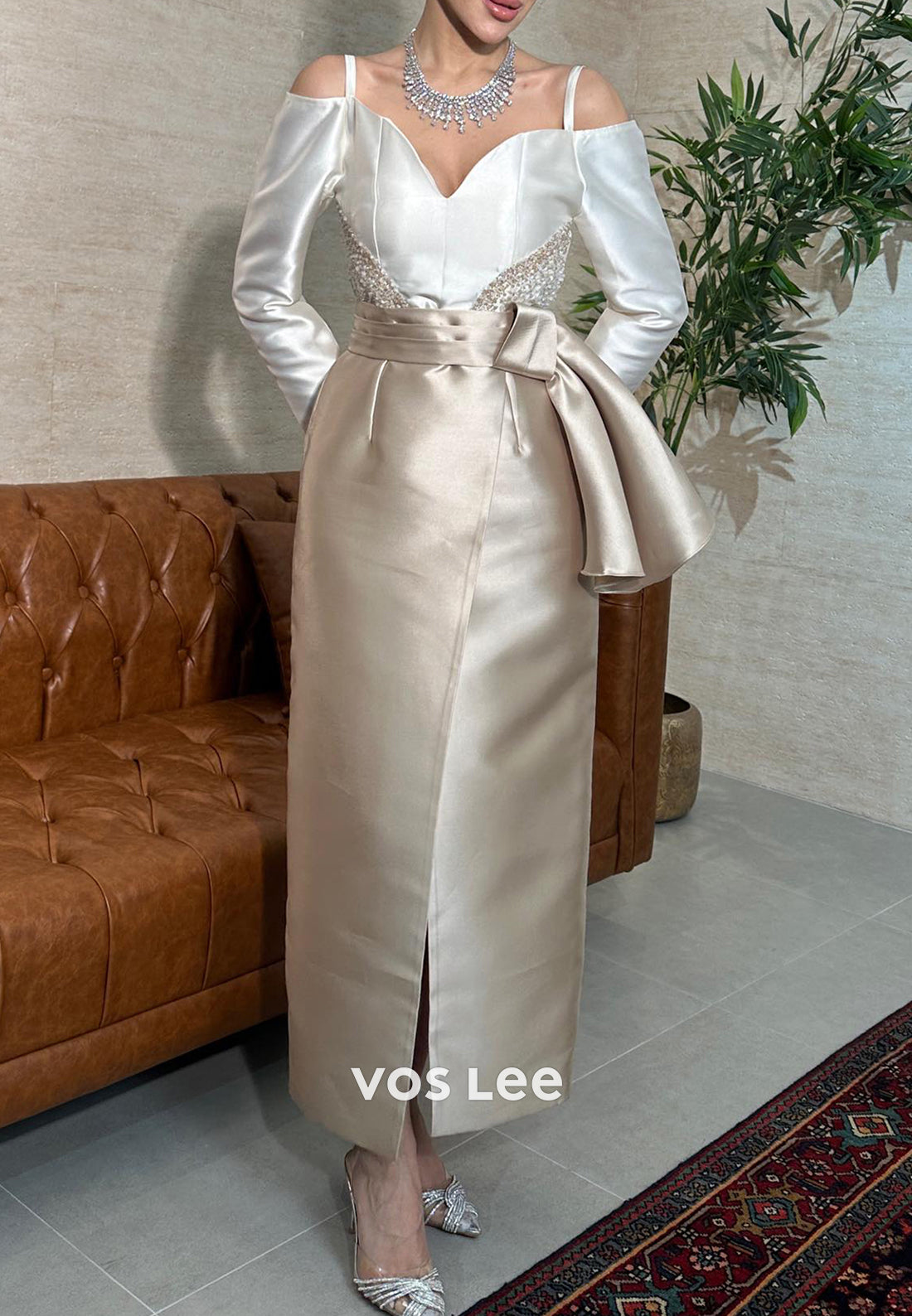 This ankle-length sheath evening dress features delicate spaghetti straps and a flattering sweetheart neckline, creating a graceful and feminine silhouette. Intricate beading embellishes the bodice, adding subtle sparkle and refined detail. The streamlined sheath cut offers a sophisticated, body-contouring fit, perfect for formal occasions where elegance and understated glamour are essential. Ideal for cocktail parties or formal dinners, this dress combines timeless style with expert craftsmanship.