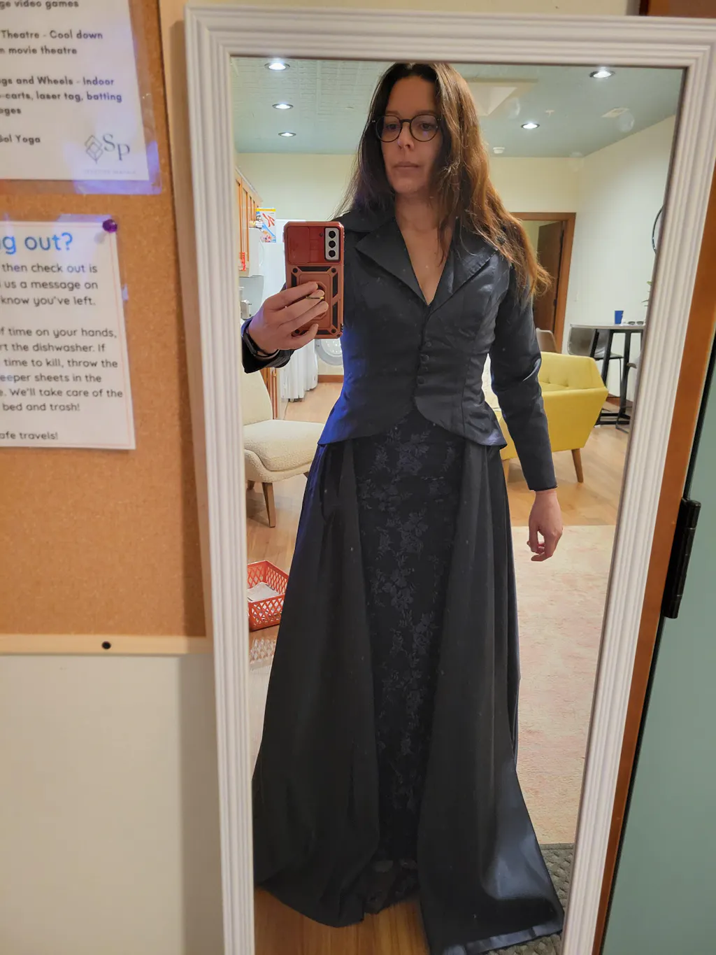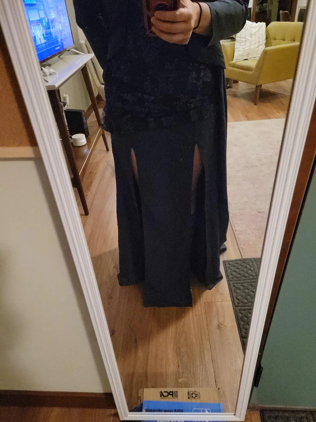 • Design: Tailored blazer-style top with structured lapel; lace floor-length skirt with thigh-high slit and flowing back panel