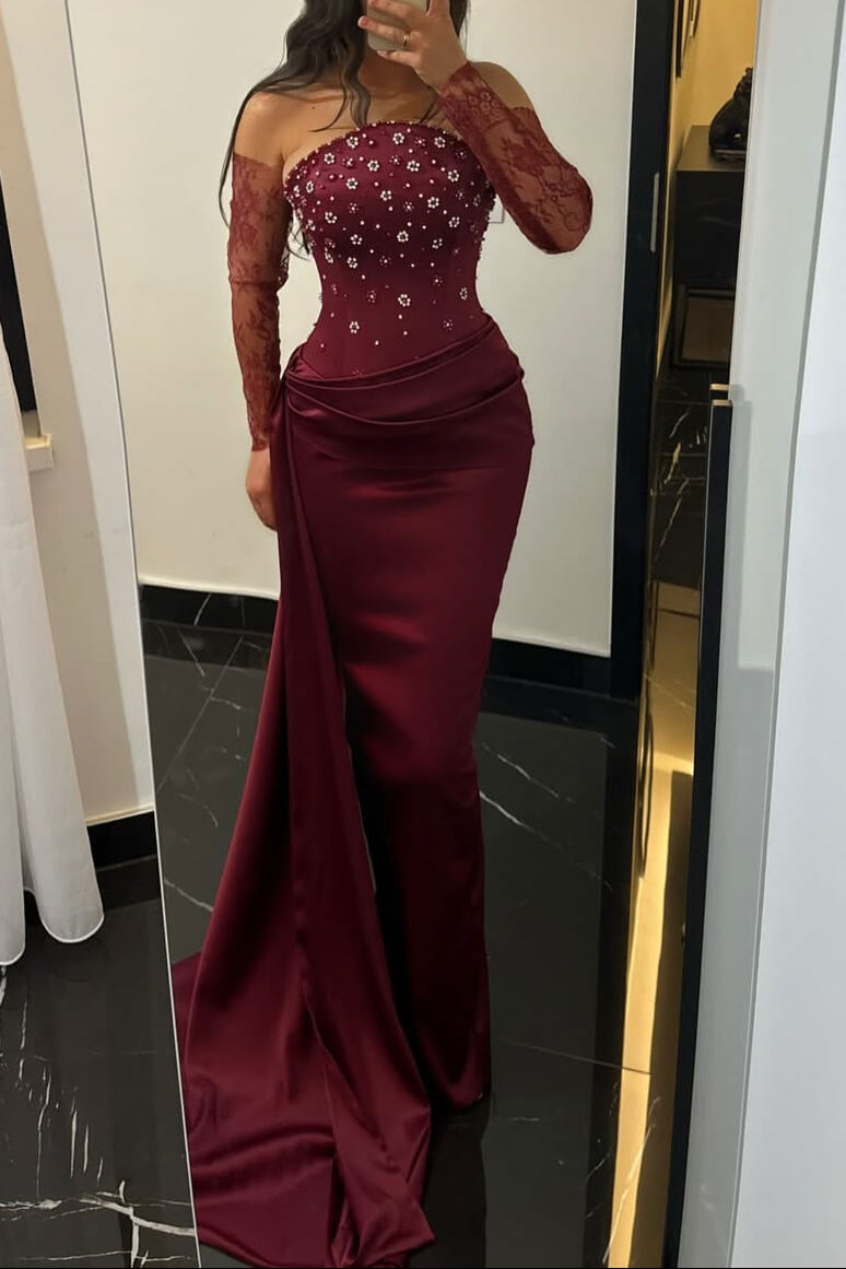 Embrace timeless elegance in this burgundy strapless mermaid gown, where sophisticated silhouette meets refined embellishment. The sleeveless design showcases a graceful neckline, while intricate beadwork cascades down the bodice and skirt, catching light with every movement. The mermaid cut hugs the body through the hips before flowing into a dramatic train, creating an unforgettable presence at formal events. Perfect for galas, black-tie affairs, and milestone celebrations where luxury and poise are paramount.