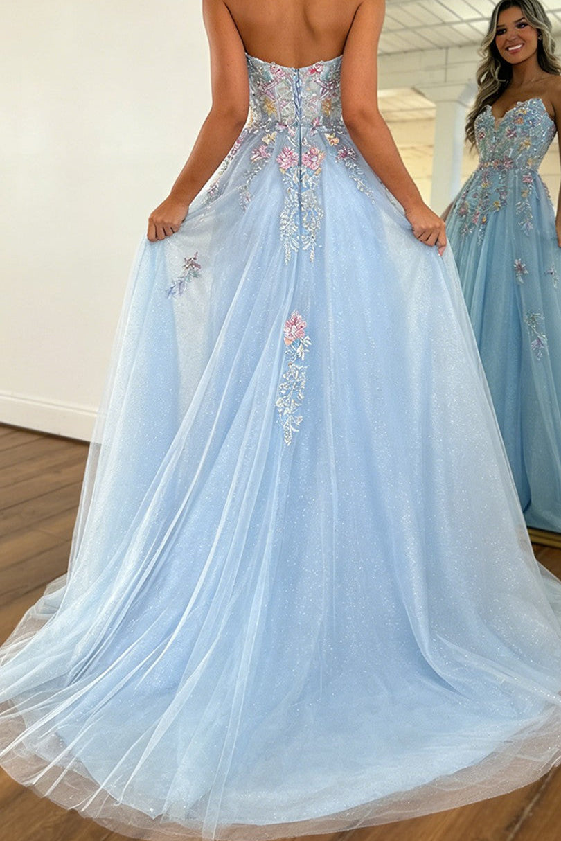 Romantic Light Blue Strapless Floral Appliqué Tulle Prom Dress with Flowing Train