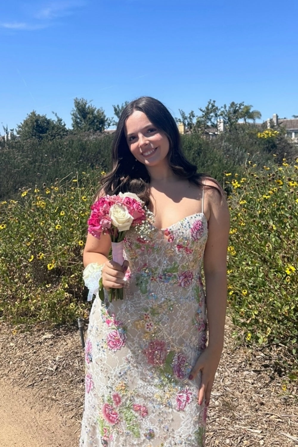 Elevate your prom night with this stunning sweetheart straps long dress, featuring intricate floral embellishments that catch the light beautifully. The sweetheart neckline flatters the décolletage while the delicate straps provide elegant support and comfort throughout the evening. Glitter accents add glamorous sparkle, making you the center of attention on the dance floor. The flowing silhouette creates a sophisticated, red-carpet-ready look perfect for formal occasions. This dress combines timeless elegance with modern embellished details for an unforgettable entrance.
