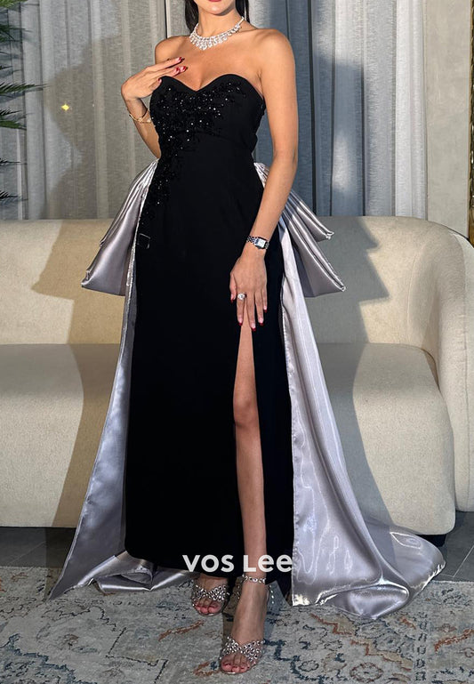 Sweetheart Satin Pleats Side Slit Black Prom Party Dress with Sweep Train