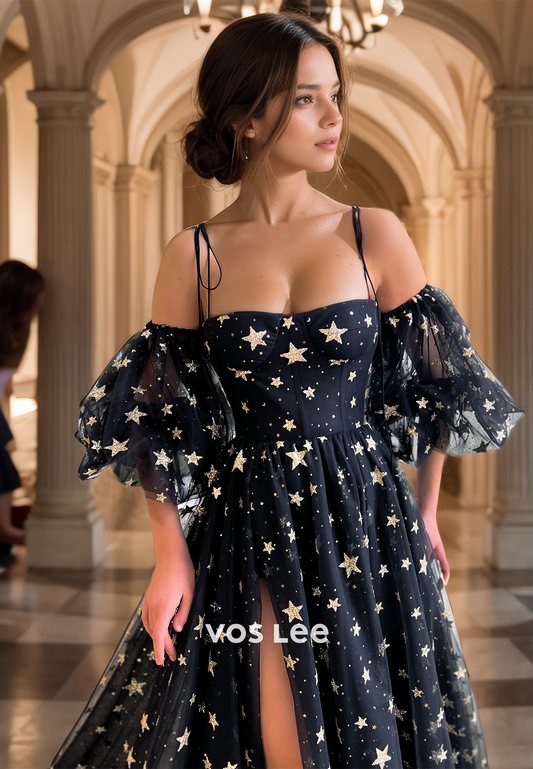 A-Line Off-Shoulder Tulle Prom Dress Charming Floor Length Night Party Gown with High Slit