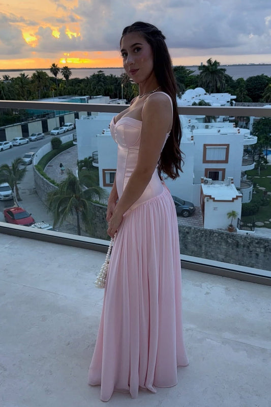 Spaghetti Straps Pink A-line Long Dress with Slit