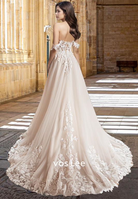 Unqiue A-Line Off Shoulder Lace Appliques Beaded 3D Floral Tulle Wedding Gown