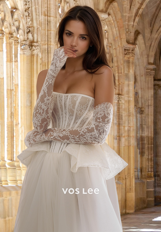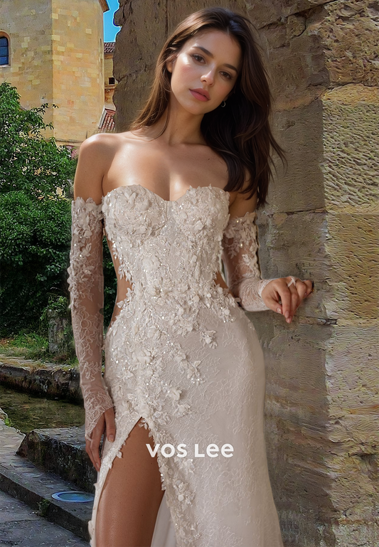 Unique A-Line Strapless Long Sleeves High Split Lace Appliques Wedding Gown