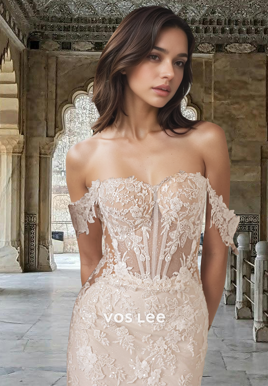 Luxury Trumpet Off Shoulder Lace Appliques Sequins Tulle Wedding Gown