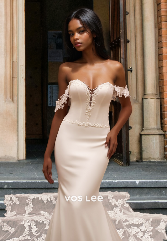 Elegant Mermaid Off Shoulder Court Train Lace Appliques Satin Wedding Dress