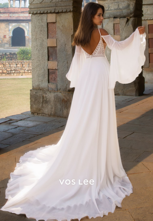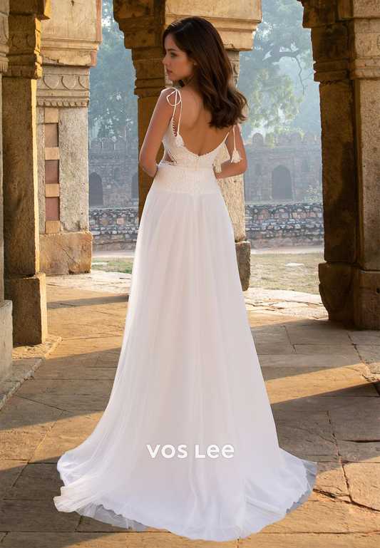Classy A-Line V Neck Spaghetti Straps Side Split Lace Pleated Wedding Dress