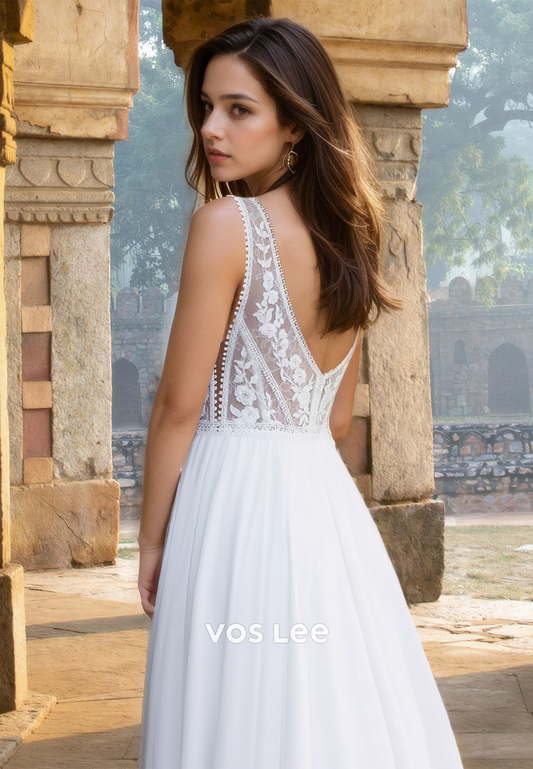 Modest A-Line Deep V Neck Sleeveless Lace Appliques Side Split Wedding Gown