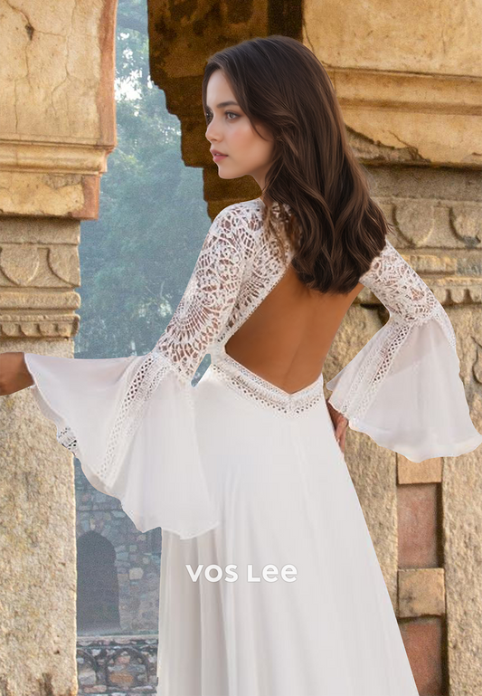 Elegant A-Line V Neck Long Sleeves Back Zipper Court Train Lace Wedding Gown