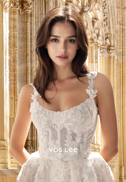 Ornate A-Line Scoop Neck Spaghetti Straps Lace Appliques Tulle Wedding Dress