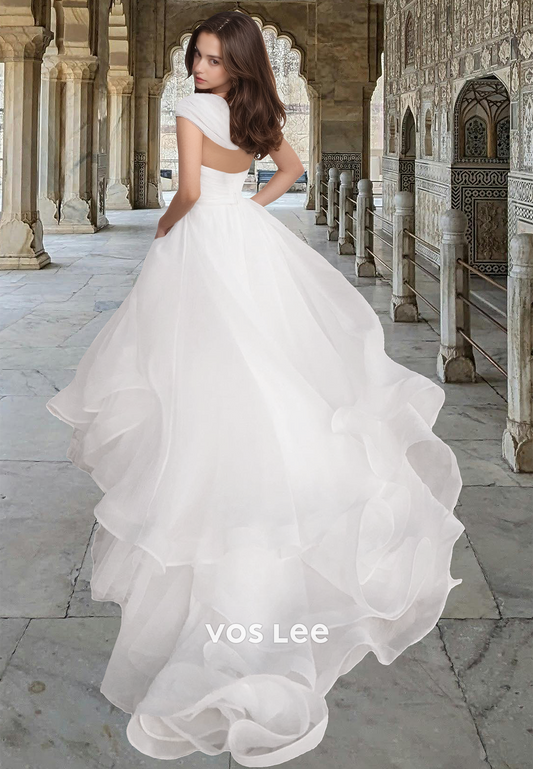 Modest Sweetheart Puff Sleeves A-Line Pleated Tulle Court Trauin Wedding Gown
