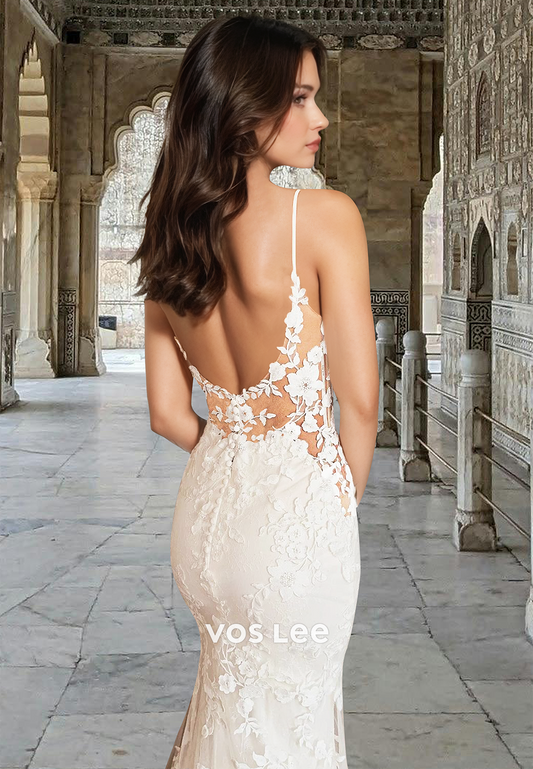 Luxury Plunging V Neck Spaghetti Straps Lace Appliques Court Train Mermaid Wedding Gown