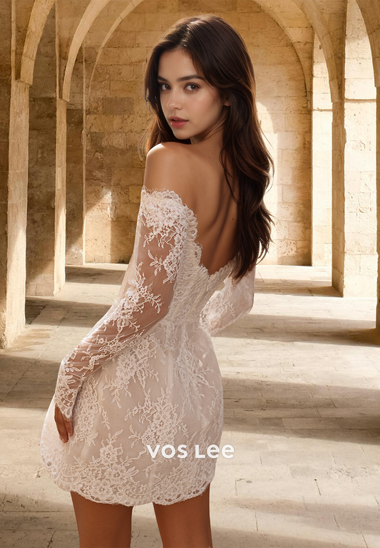 Unqiue Sheath Off Shoulder Long Sleeves Detachable Lace Up Appliques Wedding Dress