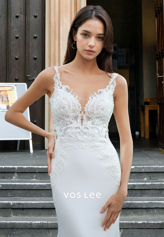 Sexy Mermaid Deep V Neck Backless Lace Appliques Pleated Wedding Dress