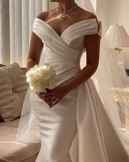 Off the Shoulder Ruched Satin Mermaid Ivory Wedding Dress