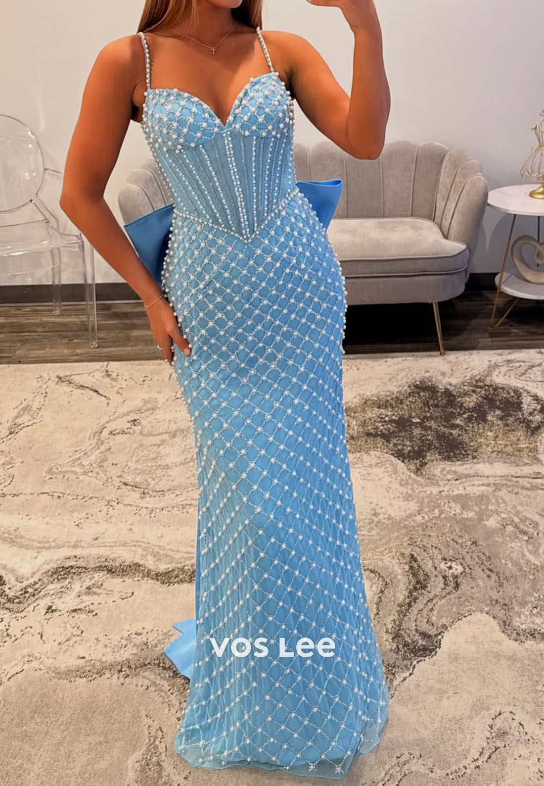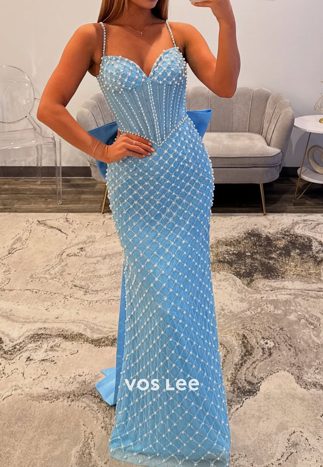 Captivate the room in this sophisticated mermaid prom dress, designed for those who command attention. Delicate spaghetti straps frame the shoulders while intricate pearl beading adorns the bodice, creating a luminous focal point. The figure-hugging mermaid silhouette flows gracefully to the floor, accentuating your curves with timeless elegance. A striking bow detail adds a refined flourish, elevating this gown from stunning to unforgettable. Perfect for prom, formal galas, or any occasion demanding couture-level sophistication.