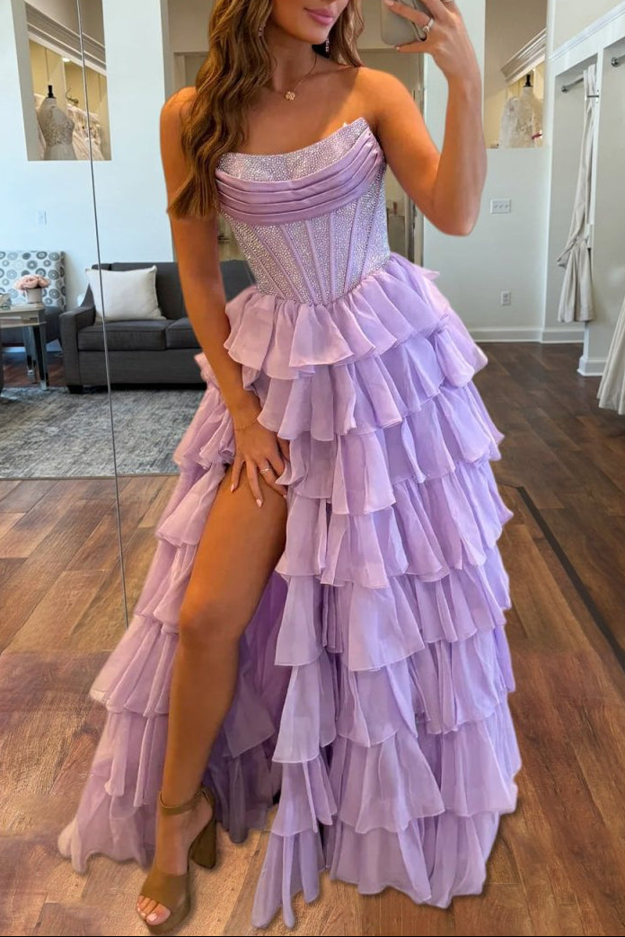 A Line Lavender Strapless Chiffon Beaded Corset Long Prom Dress With Slit