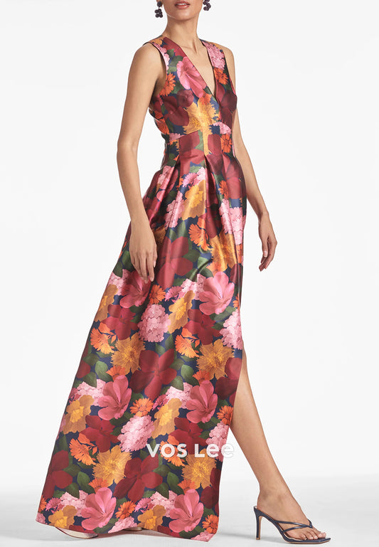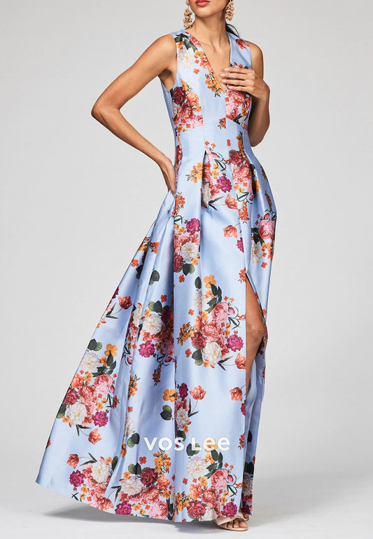 A-Line V Neck Pleated Floor-Length High Split Wedding Guest Dresses with Pockets