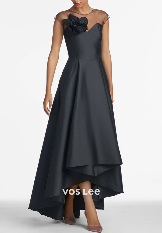Simple & Classic High Low Illusion Neck Floral Embellished Pleated Mother of Bride Dresses