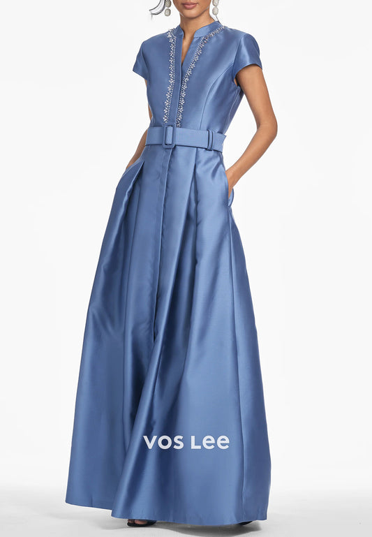 A-Line Short Sleeve V Neck Rhinestone Ruched Wedding Guest Dresses with Pockets