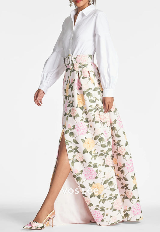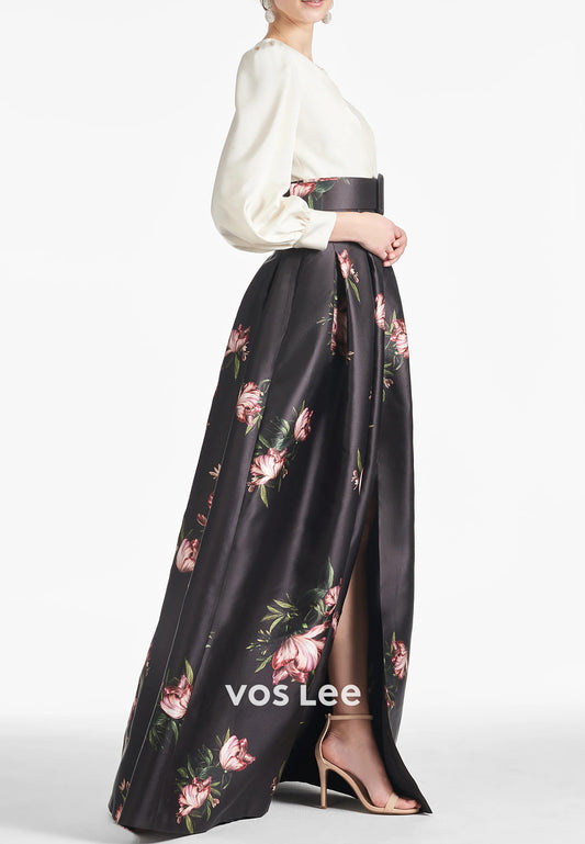 A-Line Long Sleeve V Neck Floral Embellished Pleated Wedding Guest Dresses with High Split