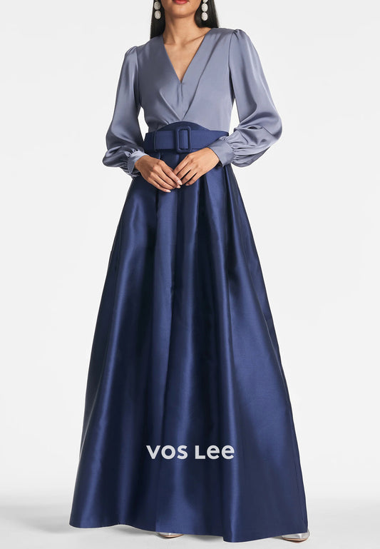 A-Line Long Sleeve V Neck Floor-Length Pleated Mother of Bride Dresses with Pockets