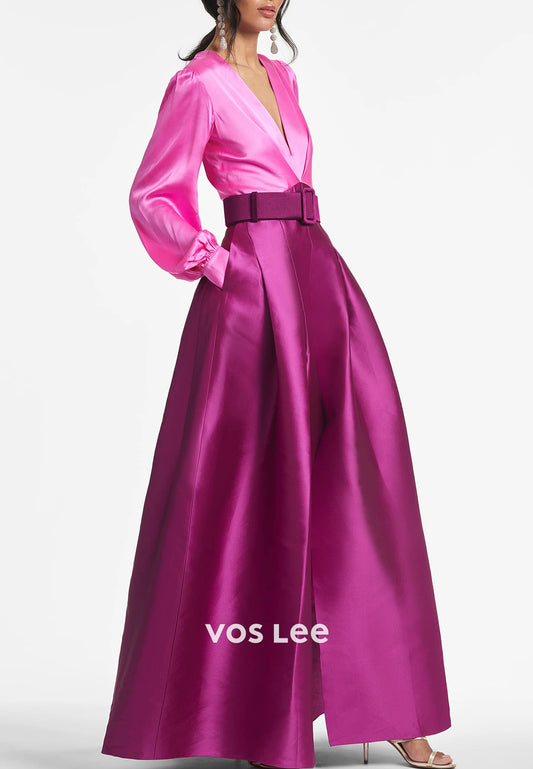 A-Line Long Sleeve V Neck Floor-Length Pleated Wedding Guest Dresses with High Split